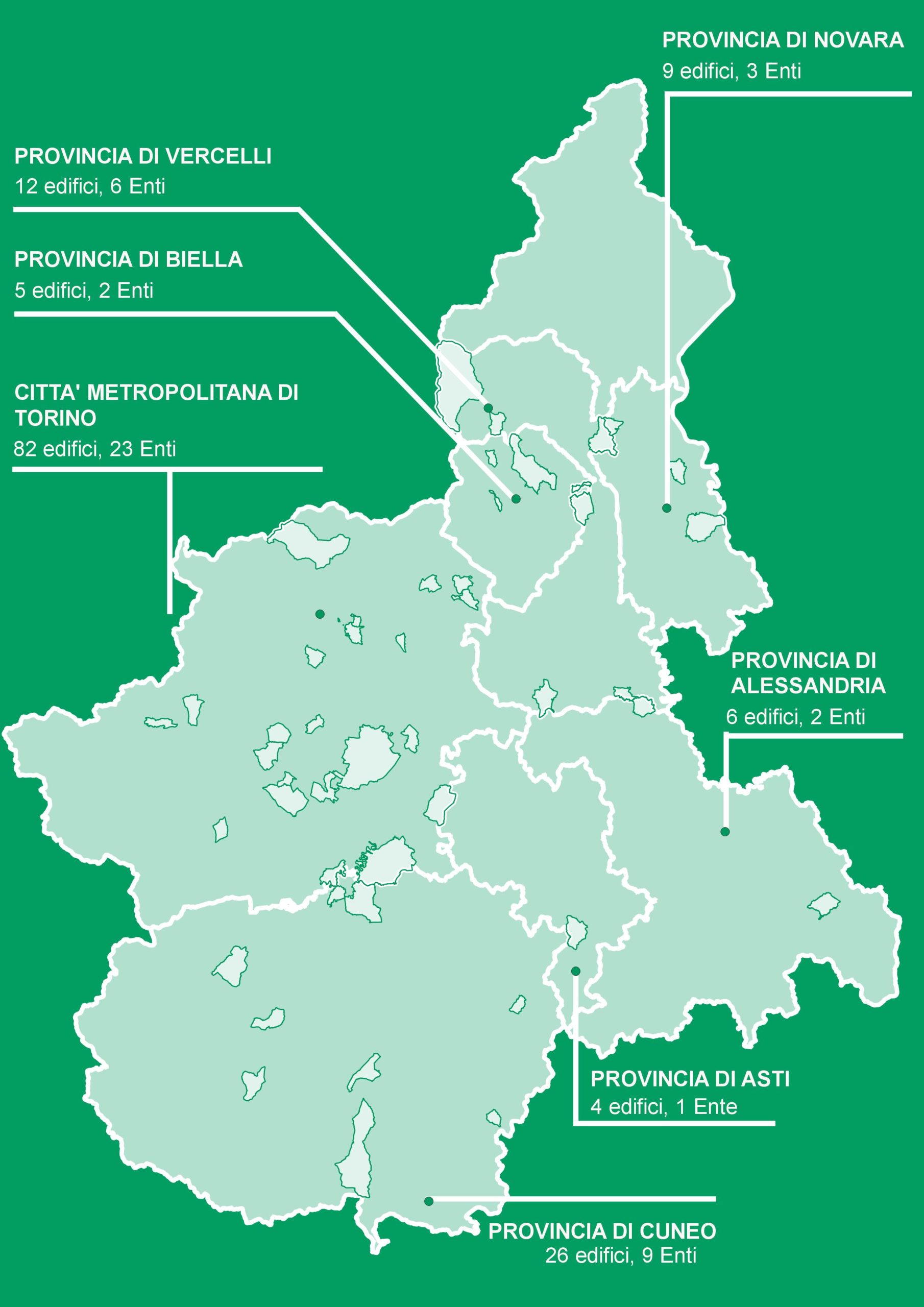 Summary of Applications: The call was open only to the provinces of Novara, Biella, Vercelli, and Verbano-Cusio-Ossola. 8 proposed buildings are located in the province of Biella, 17 in the province of Novara, 3 in Vercelli, and 9 in Verbano-Cusio-Ossola.
